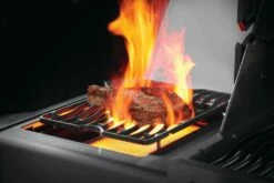 The Napoleon Prestige 500 Natural Gas Grill with Infrared Side and Rear Burners is the total grilling package; with a stunning porcelain enamel black hood and stainless steel construction, this cart model has the capabilities of a full outdoor kitchen. With four main burners, an infrared rear and side burner, this grill can cook meals using eight unique cooking styles. Grill for a crowd with a capacity for up to thirty hamburgers, and up to eight more on the side burner. You’ll know it’s a Napoleon with the Iconic WAVE cooking grids for those distinctive sear marks. Not just durable on the outside; under the lid, is the same quality stainless steel used for the tube burners, dual-level sear plates and cooking grids. Seven stainless steel sear plates provide extra surface area for any drippings from your food to vaporize, avoiding flare-ups. Never leave your barbecue on again as all the Prestige series grills come with the SafetyGlow feature where the control knobs glow red when the burner is on. Enjoy evenly cooked restuarant style meals with the rear infrared burner and rotisserie.