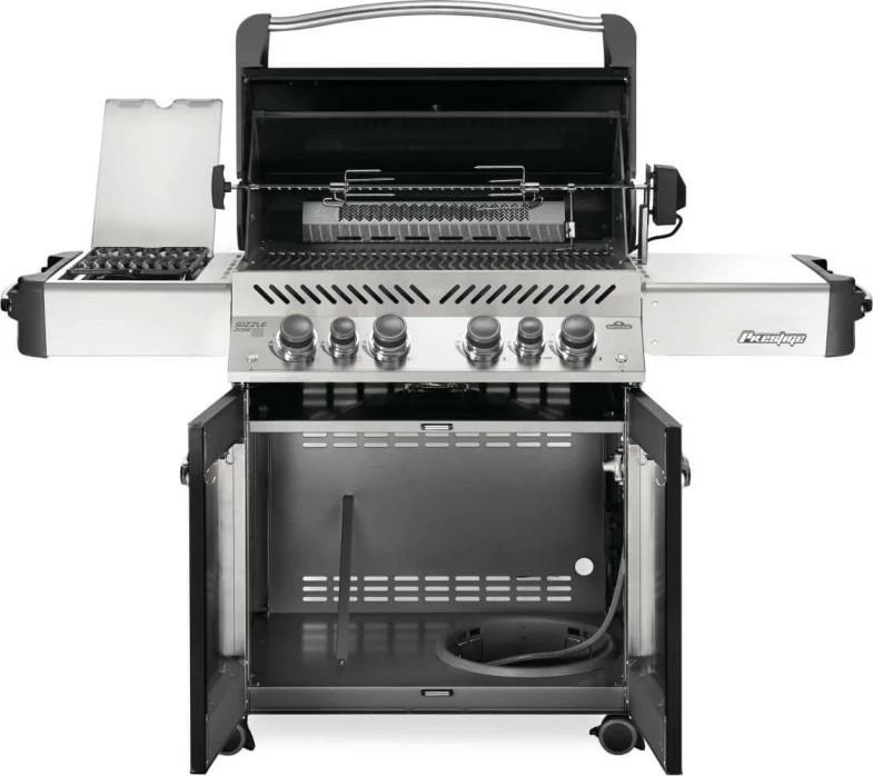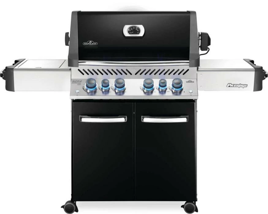 The Napoleon Prestige 500 Propane Gas Grill with Infrared Side and Rear Burners is the total grilling package; with a stunning porcelain enamel black hood and stainless steel construction, this cart model has the capabilities of a full outdoor kitchen. With four main burners, an infrared rear and side burner, this grill can cook meals using eight unique cooking styles. Grill for a crowd with a capacity for up to thirty hamburgers, and up to eight more on the side burner. You’ll know it’s a Napoleon with the Iconic WAVE cooking grids for those distinctive sear marks. Not just durable on the outside; under the lid, is the same quality stainless steel used for the tube burners, dual-level sear plates and cooking grids. Seven stainless steel sear plates provide extra surface area for any drippings from your food to vaporize, avoiding flare-ups. Never leave your barbecue on again as all the Prestige series grills come with the SafetyGlow feature where the control knobs glow red when the burner is on. Enjoy evenly cooked restuarant style meals with the rear infrared burner and rotisserie.