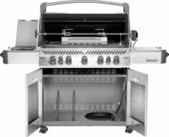 The Napoleon Prestige 665 Propane Gas Grill with Infrared Side and Rear Burners is the total grilling package; with a stunning all stainless steel hood and stainless steel construction, this full sized cart model barbecue has the capabilities of a full outdoor kitchen. With five main burners, an infrared rear and side burner, this grill can cook meals using eight unique cooking styles. You’ll know it’s a Napoleon with the Iconic WAVE cooking grids for those distinctive sear marks. Not just durable on the outside; under the lid is the same quality stainless steel used for the tube burners, dual-level sear plates and cooking grids. The stainless steel sear plates provide extra surface area for any drippings from your food to vaporize, avoiding flare-ups. Never leave your barbecue on again as all the Prestige series grills come with the SafetyGlow Feature where the control knobs glow red when the burner is on. Enjoy evenly cooked restuarant style meals with the rear infrared burner and rotisserie.