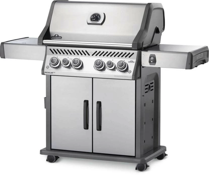 The Napoleon Rogue SE 525 Stainless Steel Propane Gas Grill with Infrared Side Burner and Rear Burner is a durable stainless steel grill. Featuring four main burners, a rear rotisserie burner, and a high top lid, this grill has everything you need to create gourmet meals. Sear restaurant-style steaks on the sizzle zone side buner, while generous side shelves provide plenty of prep space. Rogue SE models boast exclusive features including an integrated bottle opener, a high-top lid, and a sleek new control panel with backlit, ergonomic knobs. No other grill gives you such versatility with an affordable price and high-quality components. So get out there and grill different. Go, Rogue.