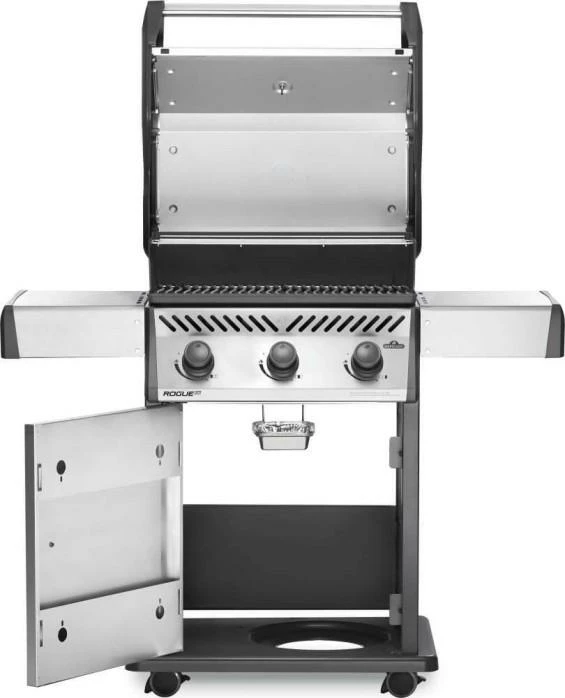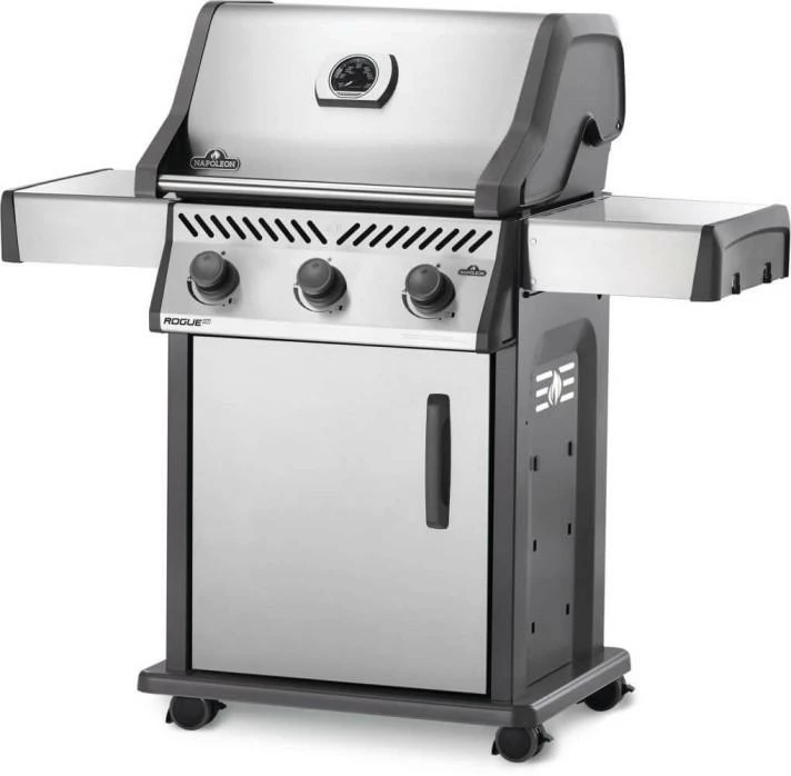 Napoleon’s Rogue XT 425 Stainless Steel Propane Gas Grill has three burners, stainless steel grids and a high top lid. This grill lights easily, every time, with a battery-free ignition. Dual-level stainless steel sear plates incinerate drippings keeping the grill clean and providing even heat. The durable finish is both stylish and easy to maintain.