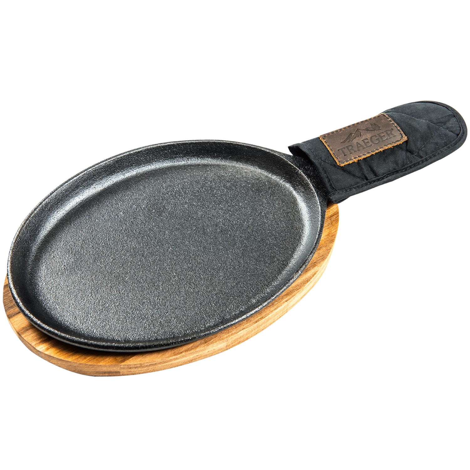 The Traeger Cast Iron Fajita Plate is a complete set, perfect for fiesta night. It features a durable, pre-seasoned cast iron skillet for cooking, a hot mitt for the handle so you can easily move it from the grill to the table, and a wooden base for serving your wood-fired fajitas in smokin’ style.