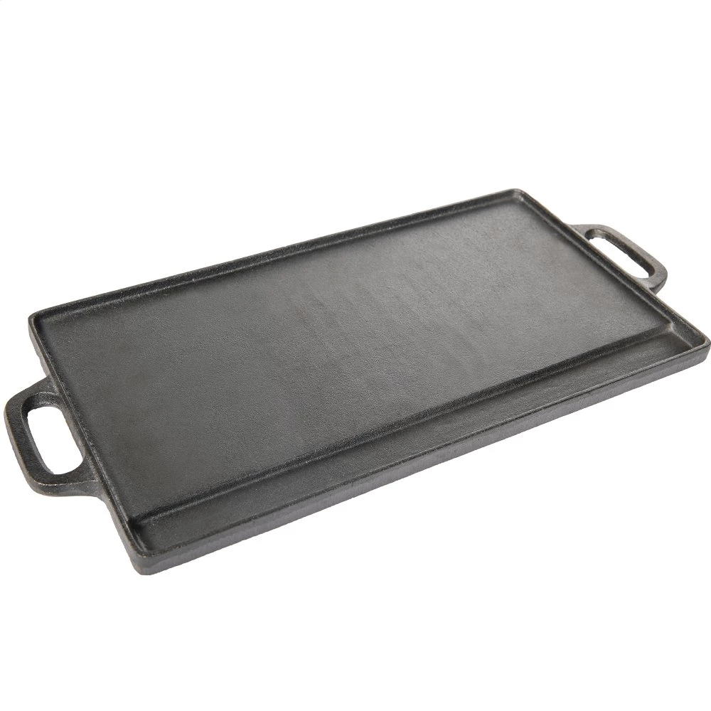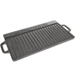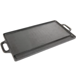 This versatile piece of cast iron cooking equipment makes cooking outdoors simple. It s pre-seasoned, double sided, and distributes heat evenly for epic grilling experiences. The ribbed side separates the fat content like a BBQ and is great for searing a steak, grilling chicken or burgers, and bacon. The smooth side is perfect for cooking pancakes, hash browns, and grilled cheese.
